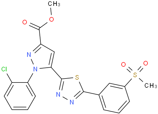 | Product Name | METHYL 1-(2-CHLOROPHENYL)-5-(5-(3-(METHYLSULFONYL)PHENYL)-1,3,4-THIADIAZOL-2-YL)-1H-PYRAZOLE-3-CARBOXYLATE |